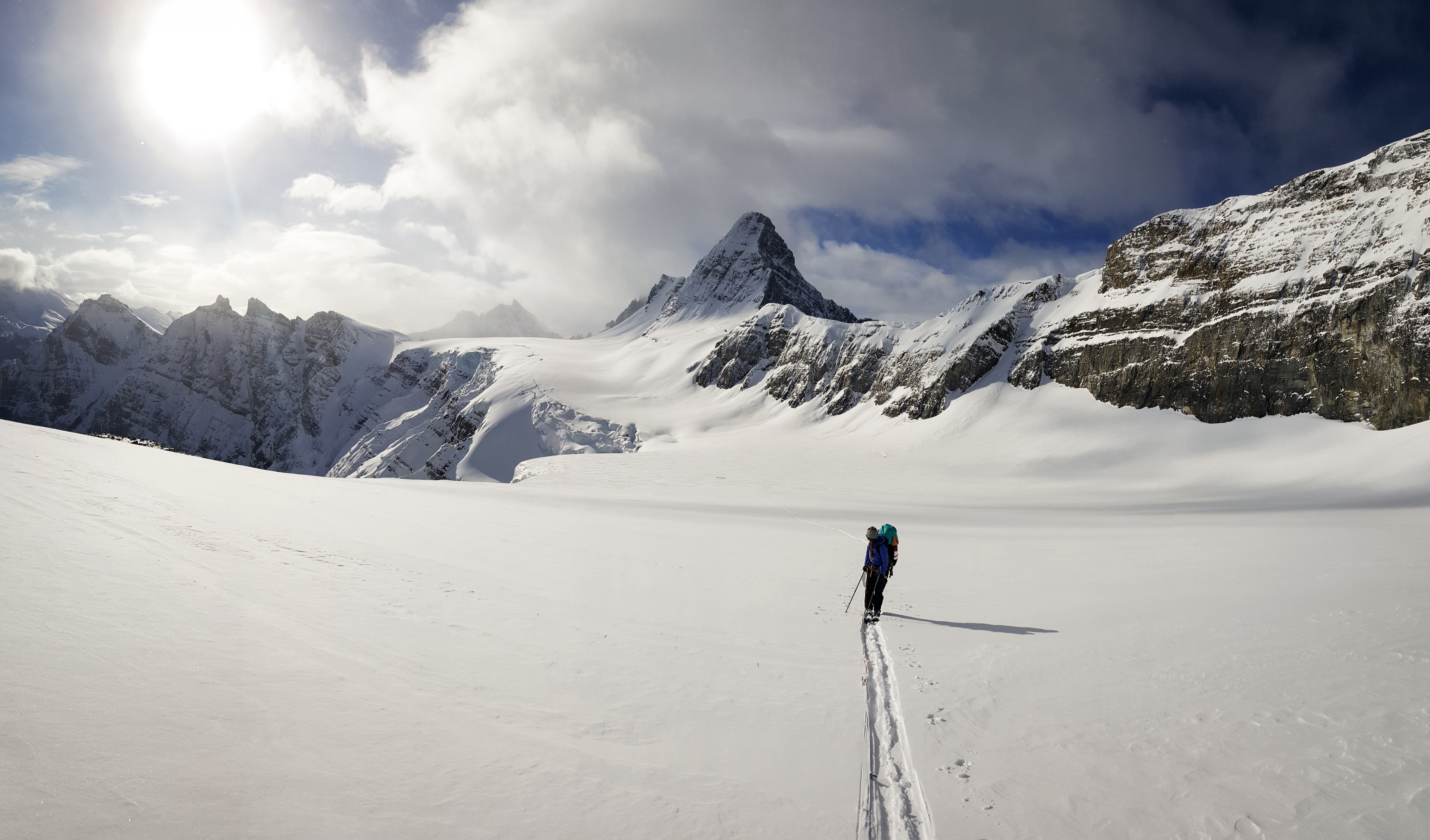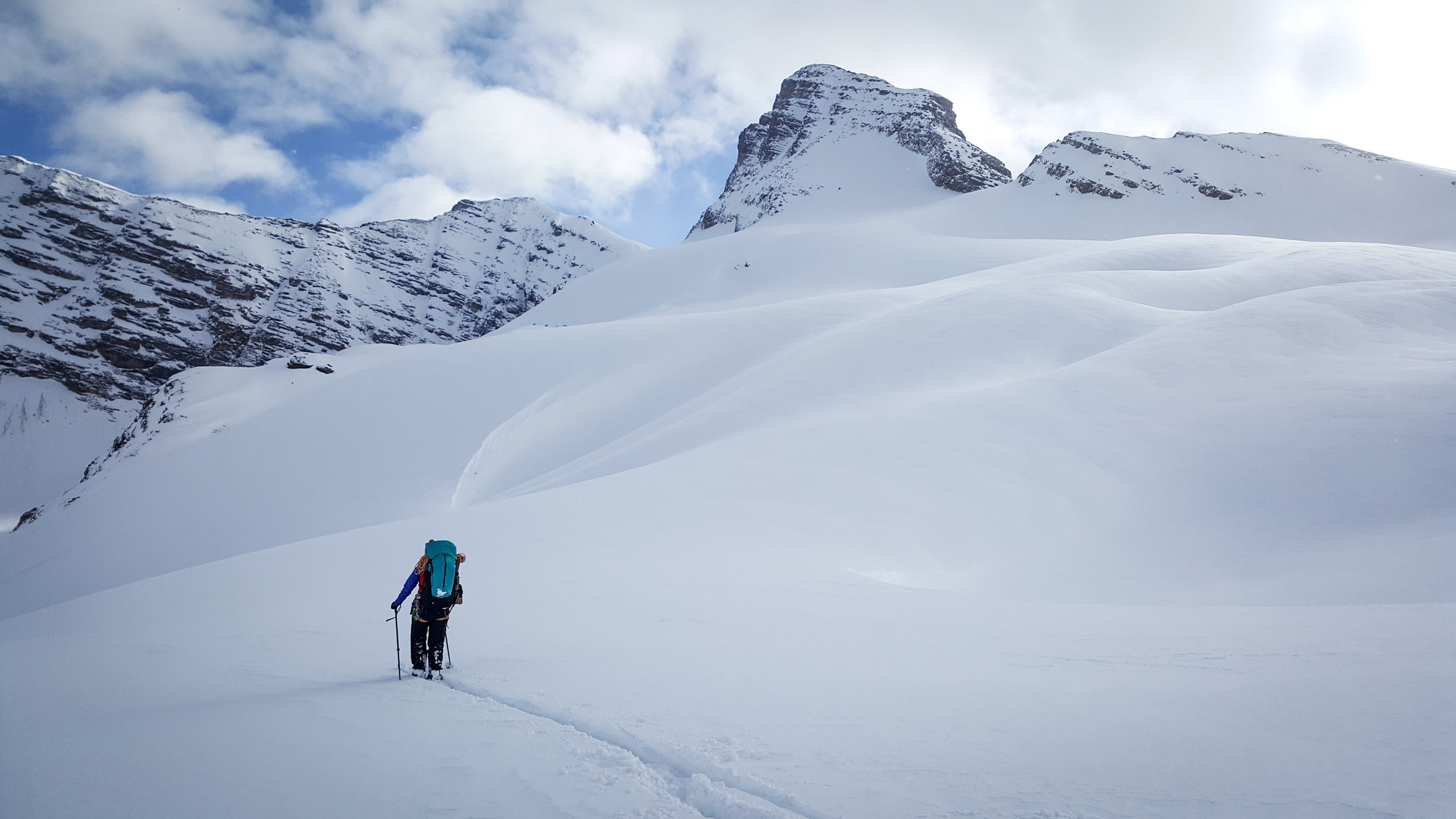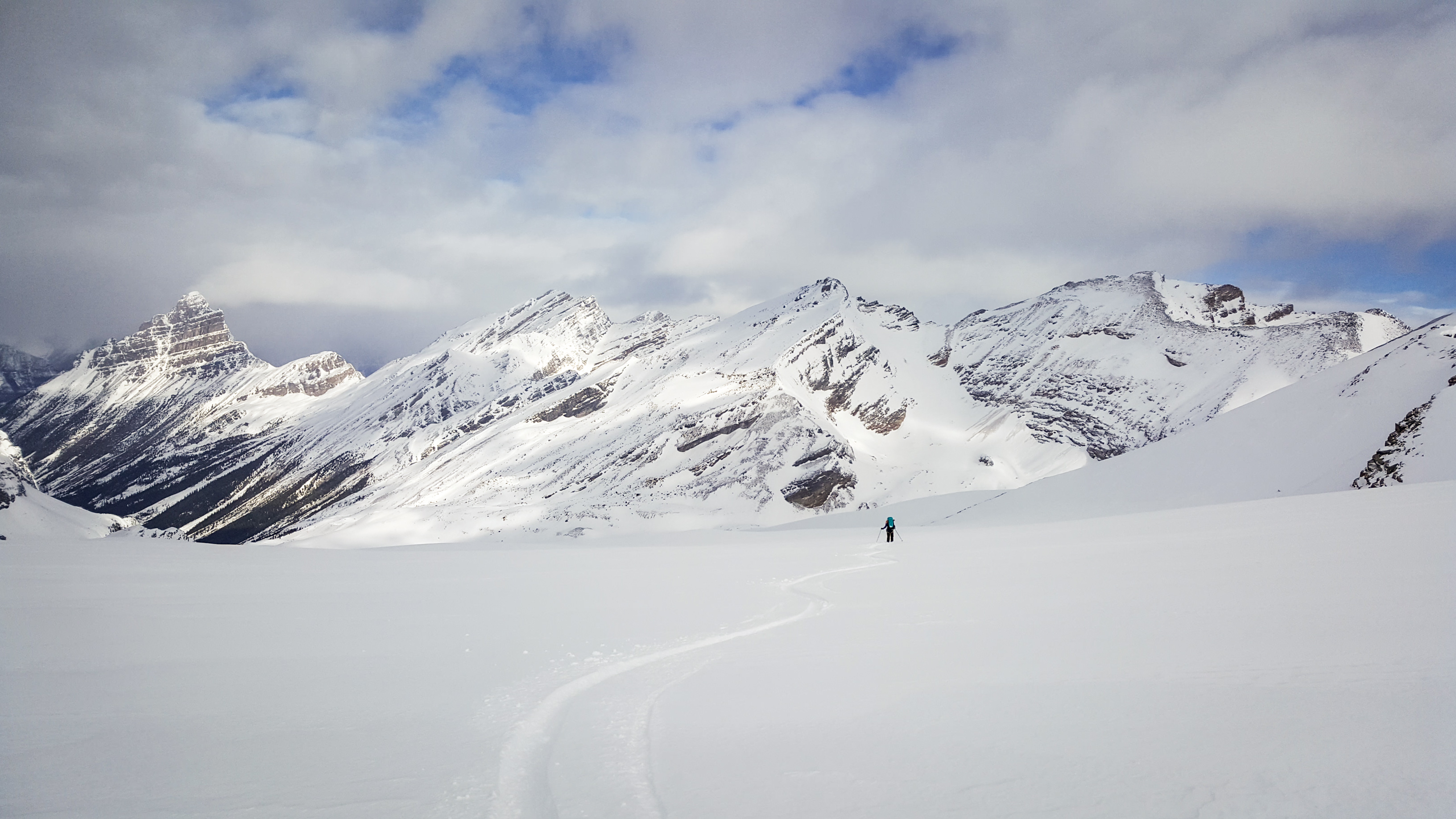 The approach up Diadem Creek had been pounded in by snowshoers, which made for easy travel. Travelling off the beaten track in the valley bottom required knee deep trail breaking in unconsolidated snow. Once on the glaciers we found an average of 250-300cm of snow, with a few visible sags. There currently are some train car sized cornices on the ridge between Mount GEC and Mount Nelson that leave you feeling quite vulnerable as you traverse the bench below them. Ski quality was good on polar aspects with boot top powder on the Gong Glacier.