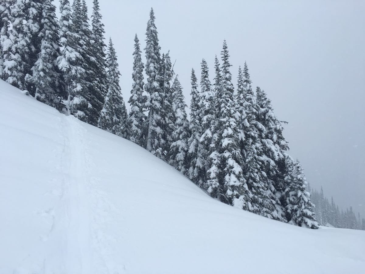 We skied a few runs in the Flute and Oboe area on the 13th. At 1900m there was ~30cm of new snow on top of last weeks crust. This new snow tapered to about 10cm at 1600m. We did not see any new avalanches. Cornices were growing rapidly and we observed only cracking in the top 20cm where a soft slab was present in wind loaded areas.