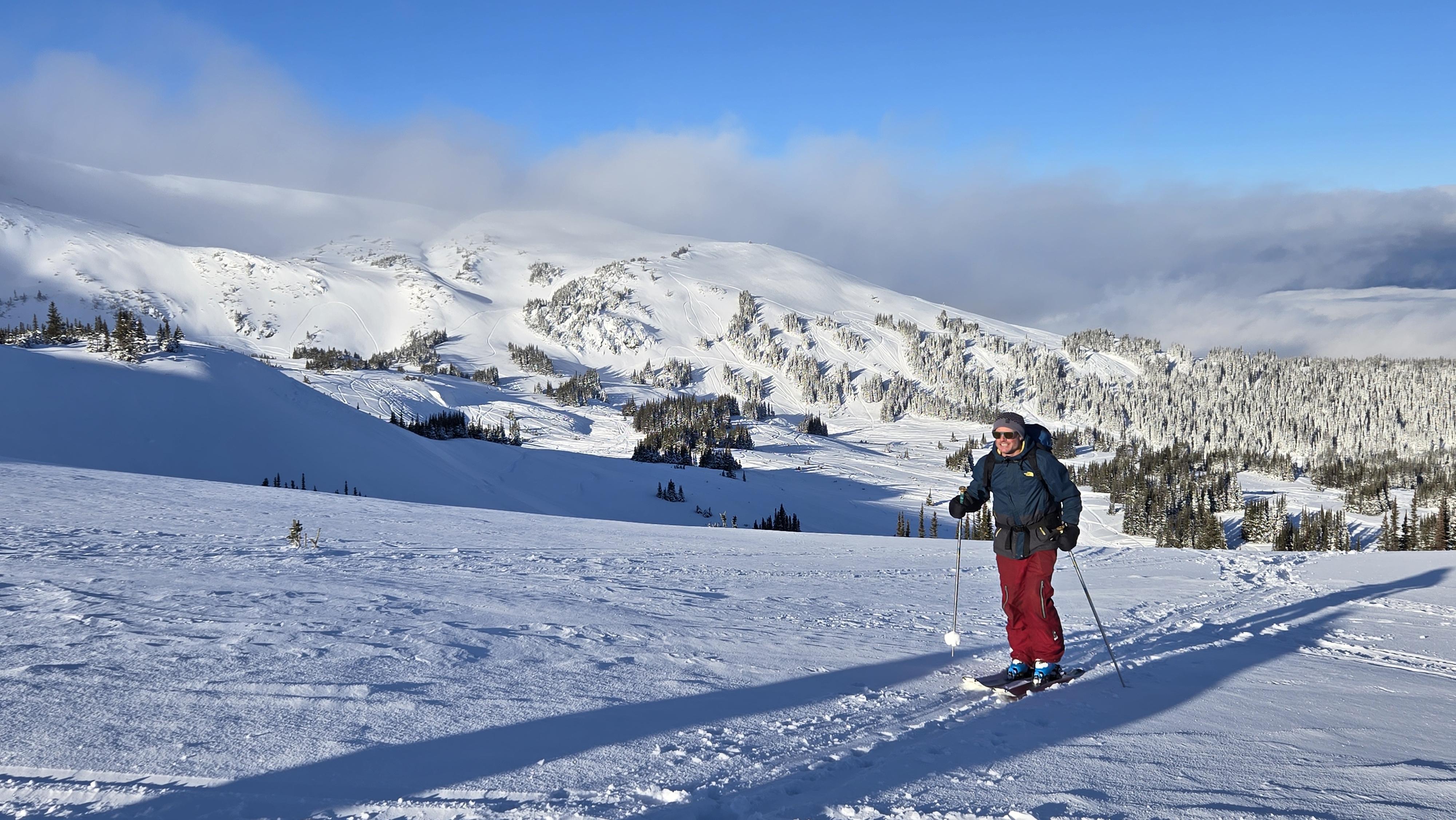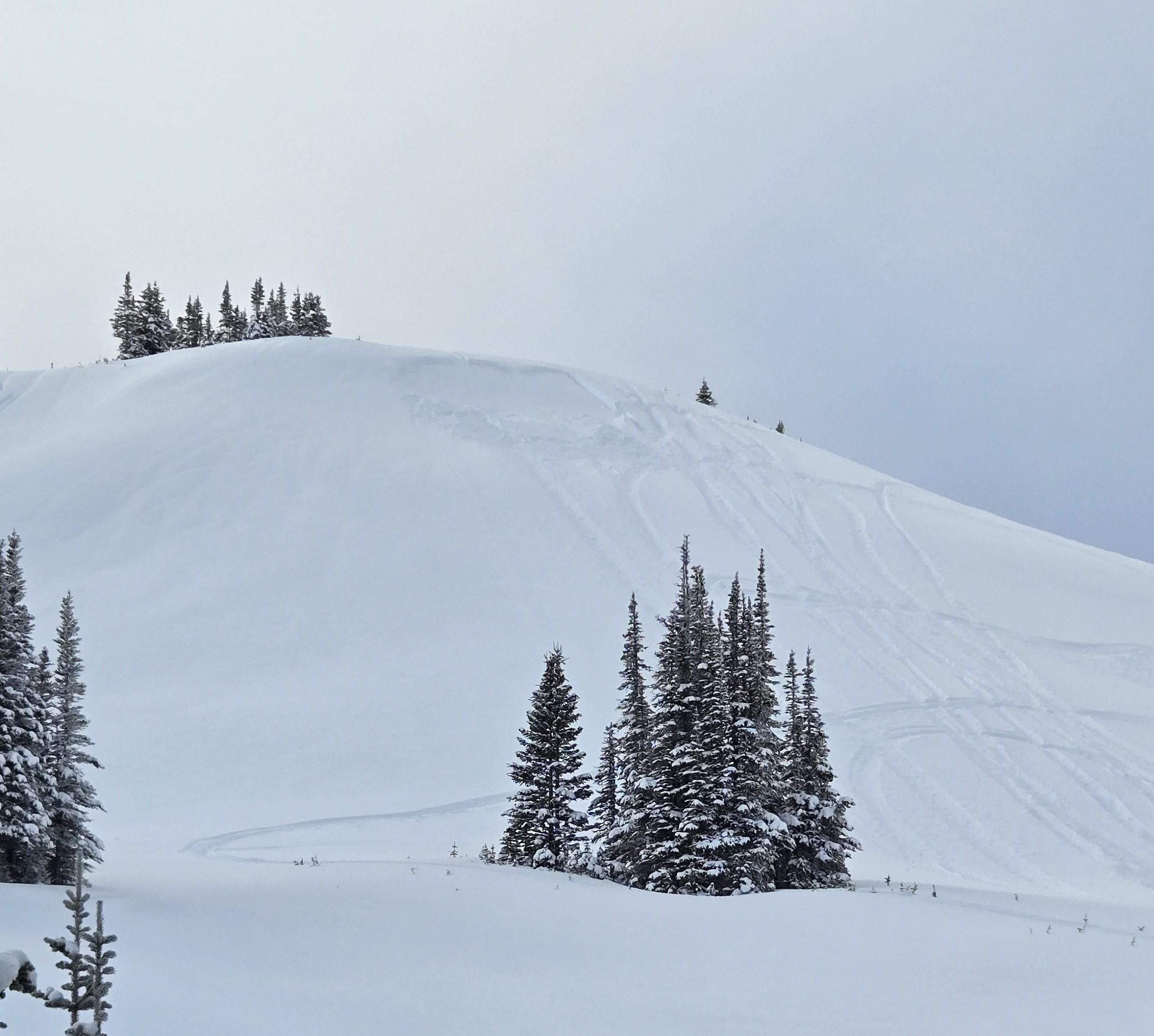 Despite the warm temperatures, snow density remained light at higher elevations, creating fantastic ski conditions and no storm slab problem. Winds were SW-NW and generally light to moderate (strong Friday evening). We maintained vigilance, generally avoiding any wind-exposed ALP/TL feature due to reactive wind slabs being the primary concern. Surprisingly, we saw no natural avalanche activity and just two size 1 sled-triggered windslab avalanches in the Lucille riding area (see photo) on Sunday (one was 12 hrs old). Multiple whumphs and one shooting crack were observed on McBride Peak both Friday and Saturday. HS was around 150cms @ TL on the Rockies side and 120cms on the Cariboos side. Of note was in the Kristi drainage on Thursday where there was just 60cms of snow with a 1cm MFcr just below the surface @ 1300m. We do not know how high that crust persisted and elected to stay out of there for the rest of the week.