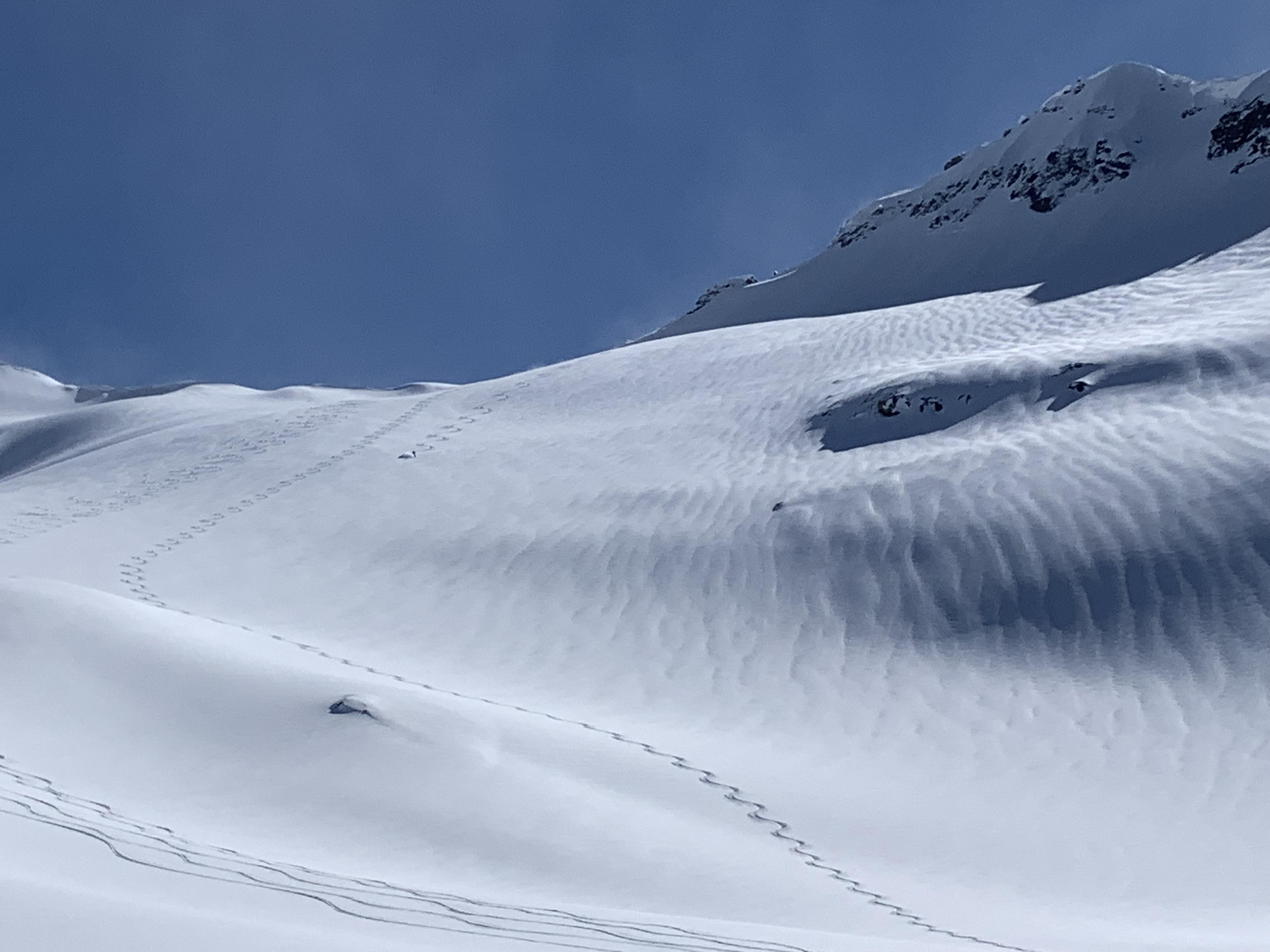 We found excellent predictable powder skiing from 2200m to 2600m. Temperature hovered around -5, felt colder higher up in the wind but much warmer lower in sheltered locations. An easterly wind came and went at ridge top, with very little impact on ski quality. Some convective clouds rolled over the ridges but was mostly limited to the solar sides.